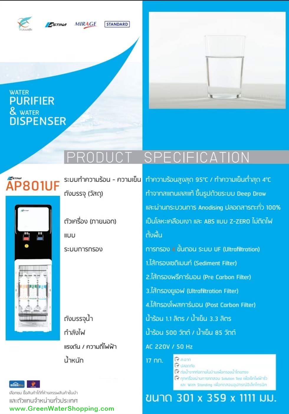 ตู้กดน้ำเย็น-น้ำร้อน พร้อมระบบกรองน้ำ UF ASTINA - รุ่น AP801UF(รุ่นต่อตรงจากน้ำประปา)