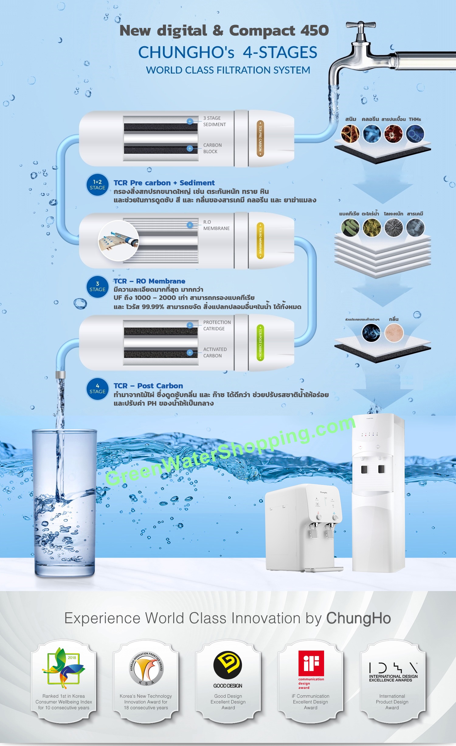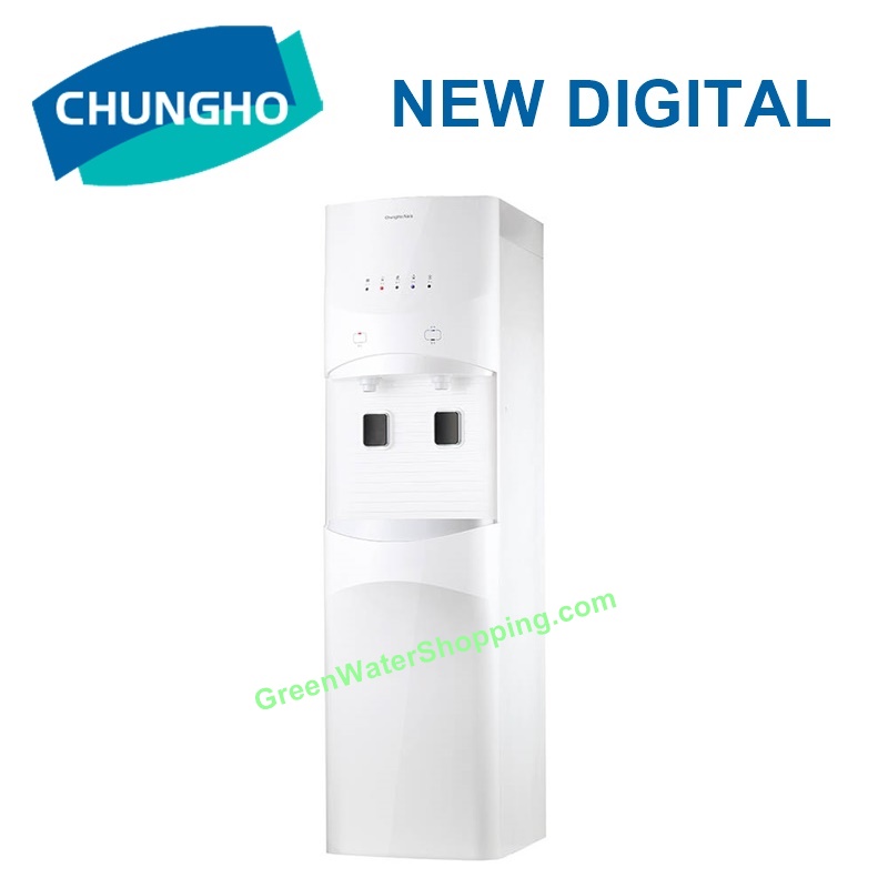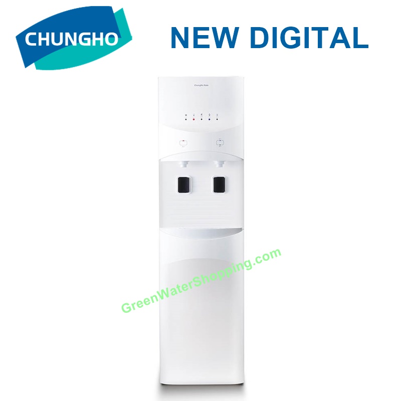 ตู้กดน้ำดื่ม ร้อน-เย็น แบบตั้งพื้น แบรนด์ CHUNGHO (ชุงโฮ) รุ่น NEW DIGITAL- ตู้กดน้ำร้อน-เย็น พร้อมการกรอง RO 4 ขั้นตอน CHUNGHO รุ่น NEW DIGITAL มาด้วยดีไซน์ที่สวยงาม วัสดุอย่างดีที่สุด แข็งแรงทนทาน และเทคโนโลยีการกรองน้ำที่ทันสมัยจากประเทศเกาหลี และ สหรัฐอเมริกา โดยสามารถกรองแบคทีเรียและเชื้อไวรัสได้สูงถึง 100% ด้วยระบบการกรองระบบ RO 4 ขั้นตอน ที่มีความละเอียดสูง 0.0001 ไมครอน สามารถมั่นใจได้ถึงความสะอาด ปลอดภัยในน้ำดื่ม และยังกำจัดปัญหาน้ำกร่อยได้ 100% โดยตัวเครื่องผลิตและนำเข้าจากประเทศเกาหลี