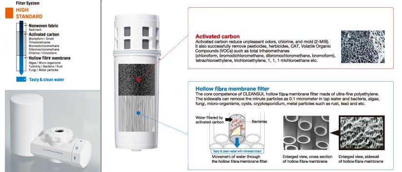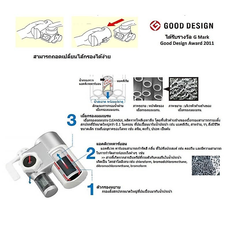 -ไส้กรอง 3 ขั้นตอน: ไส้กรองหยาบ, ไส้กรองคาร์บอน (Activated Carbon) และ ไส้กรอง Hollow fiber (UF) membranes (ทำจากพลาสติก Polyethylene)
