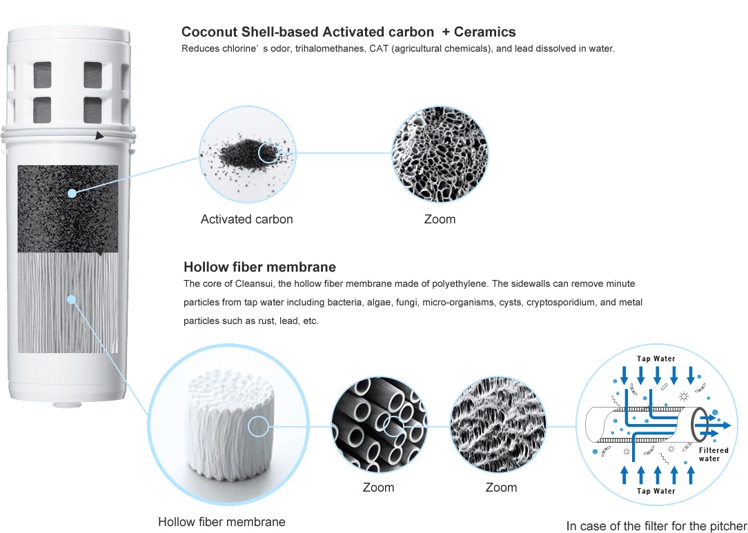 -ไส้กรอง 4 ขั้นตอน: ไส้กรองหยาบ, ไส้กรอง Ceramic, ไส้กรองคาร์บอน (Activated Carbon) และ ไส้กรอง Hollow fiber (UF) membranes (ทำจากพลาสติก Polyethylene)