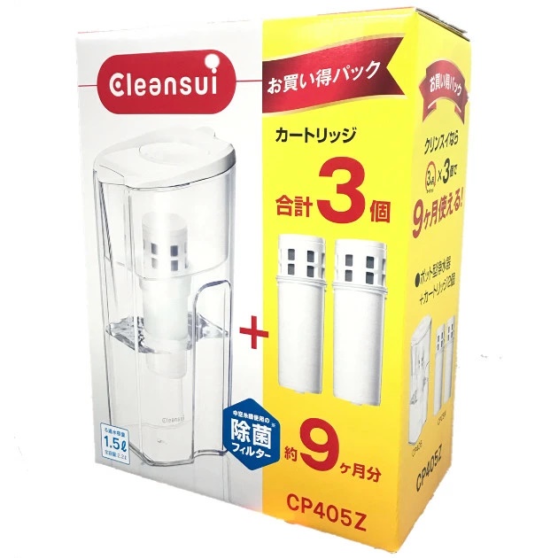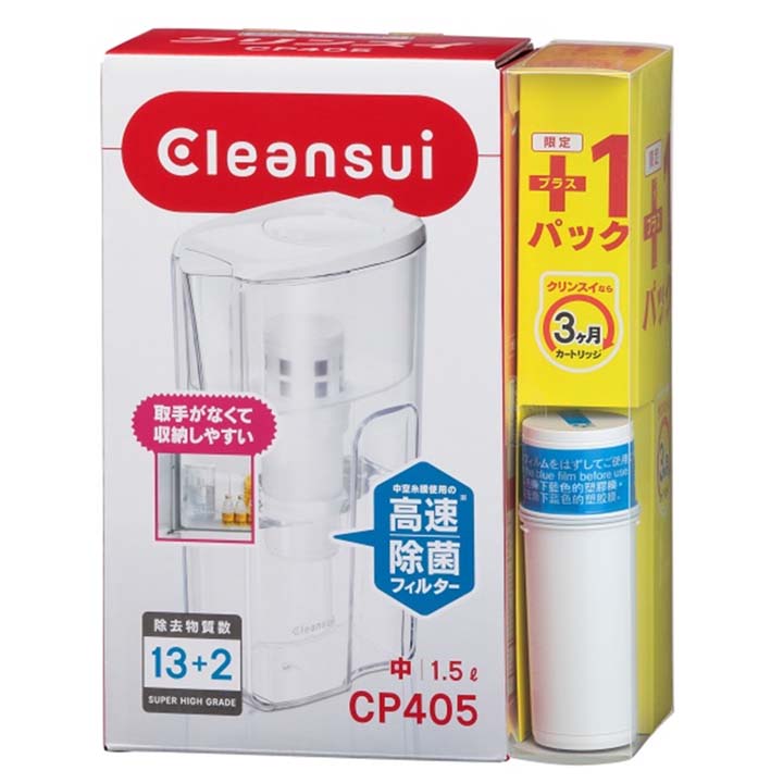 เหยือกกรองน้ำ Mitsubishi Cleansui มิตซูบิชิ คลีนซุย รุ่น CP405 ( ไส้กรอง Super High Grade Filter) - เป็นเหยือกกรองน้ำ ขนาด 1.5 ลิตร คุณภาพสูงนำเข้าจากประเทศญี่ปุ่น ส่วนประกอบของเหยือกทำมาจากพลาสติก อย่างดี ปลอดภัย ปลอดสาร BPA และไส้กรองมีเยื่อ UF fibre Membrane ที่มีความละเอียดสูงถึง 0.1 ไมครอน สามารถในการกรองสารที่ปนเปื้อนมากับน้ำได้ถึง 13+2 ชนิด ทั้งยังปรับสภาพน้ำให้เป็นน้ำอัลคาไลน์ เพื่อสุขภาพที่ดีขึ้นอีก ไส้กรองน้ำมาพร้อมด้วยเทคโนโลยีคาร์บอนเคลือบซิลเวอร์ ที่ช่วยยับยั้งการเกิดแบคทีเรียขณะใช้งานได้