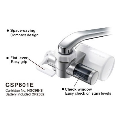 เครื่องกรองน้ำแบบต่อก็อกซิงค์ Mitsubishi Cleansui รุ่น CSP601 (Super High Grade Filter) - เครื่องกรองน้ำมิตซูุบิชิ ครีนซุย คุณภาพสูง ผลิตจากประเทศญี่ปุ่น (Made-In-Japan)โดดเด่นด้วยดีไซน์เล็กกะทัดรัด สวยงาม ติดตั้งง่ายเข้ากับก็อกน้ำซิงค์ด้วยตนเอง วัสดุทำจากพลาสติก ABS แข็งแรง ทนทาน มาพร้อมไส้กรองที่ผลิตด้วยเทคโนโลยีชั้นสูง "จิ๋วแต่แจ๋ว" ด้วยการกรองถึง 4 ขั้นตอนในชิ้นเดียว สามารถกรองน้ำด้วยความละเอียดมากถึง 0.1 ไมครอน สามารถกรองเชื้อโรคต่างๆ กำจัดแบคทีเรียในน้ำได้ถึง 99.99% และสารละลายที่ไม่พึงประสงค์ออก แต่ยังคงไว้ซึ่งแร่ธาตุต่างๆในน้ำ ทำให้ได้น้ำดื่มที่สะอาดและปลอดภัยแก่การดื่มกิน ทั้งยังง่ายต่อการใช้งาน รุ่นนี้ยังมีจอ LCD ระบุจำนวนลิตรที่เหลือใช้งาน (เริ่มต้นที่ 900 ลิตร และเปลี่ยนไส้กรองเมื่อลดถึง 0) อีกทั้งยังเปลี่ยนไส้กรองได้โดยง่ายด้วยการบิดแล้วดึงออก