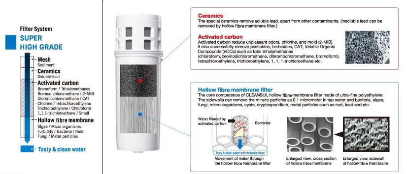 -ไส้กรอง 4 ขั้นตอน: ไส้กรองหยาบ, ไส้กรอง Ceramic, ไส้กรองคาร์บอน (Activated Carbon) และ ไส้กรอง Hollow fiber (UF) membranes (ทำจากพลาสติก Polyethylene)