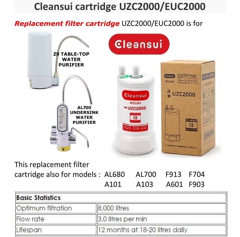 ไส้กรองน้ำ Mitsubishi Cleansui รุ่น EUC2000 หรือ UZC2000 (รุ่นเดียวกันแต่ใช้ 2 ชื่อ) (Super High Grade Filter) สำหรับเครื่องกรองน้ำ Mitsubishi Cleansui แบบเคาว์เตอร์ท็อป หรือ แบบใต้ซิงค์ รุ่น AL700, A101, A601, F704, F903, F914 และ Z9 - ไส้กรองน้ำมิตซูุบิชิ ครีนซุย คุณภาพสูง ผลิตจากประเทศญี่ปุ่น (Made-In-Japan)โดดเด่นด้วยดีไซน์เล็กกะทัดรัด สวยงาม เป็นไส้กรองที่ผลิตด้วยเทคโนโลยีชั้นสูง ด้วยการกรองถึง 4 ขั้นตอนในชิ้นเดียว สามารถกรองน้ำด้วยความละเอียดมากถึง 0.1 ไมครอน สามารถกรองเชื้อโรคต่างๆ กำจัดแบคทีเรียในน้ำได้ถึง 99.99% และสารละลายที่ไม่พึงประสงค์ออก แต่ยังคงไว้ซึ่งแร่ธาตุต่างๆในน้ำ ทำให้ได้น้ำดื่มที่สะอาดและปลอดภัยแก่การดื่มกิน โดยผ่านมาตรฐานการหรองน้ำระดับโลก NSF ทั้งยังเปลี่ยนไส้กรองได้โดยง่ายด้วยการถอดใส่สายน้ำเข้าออกเท่านั้น