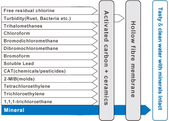 -ไส้กรอง 4 ขั้นตอน: ไส้กรองหยาบ, ไส้กรอง Ceramic, ไส้กรองคาร์บอน (Activated Carbon) และ ไส้กรอง Hollow fiber (UF) membranes (ทำจากพลาสติก Polyethylene)