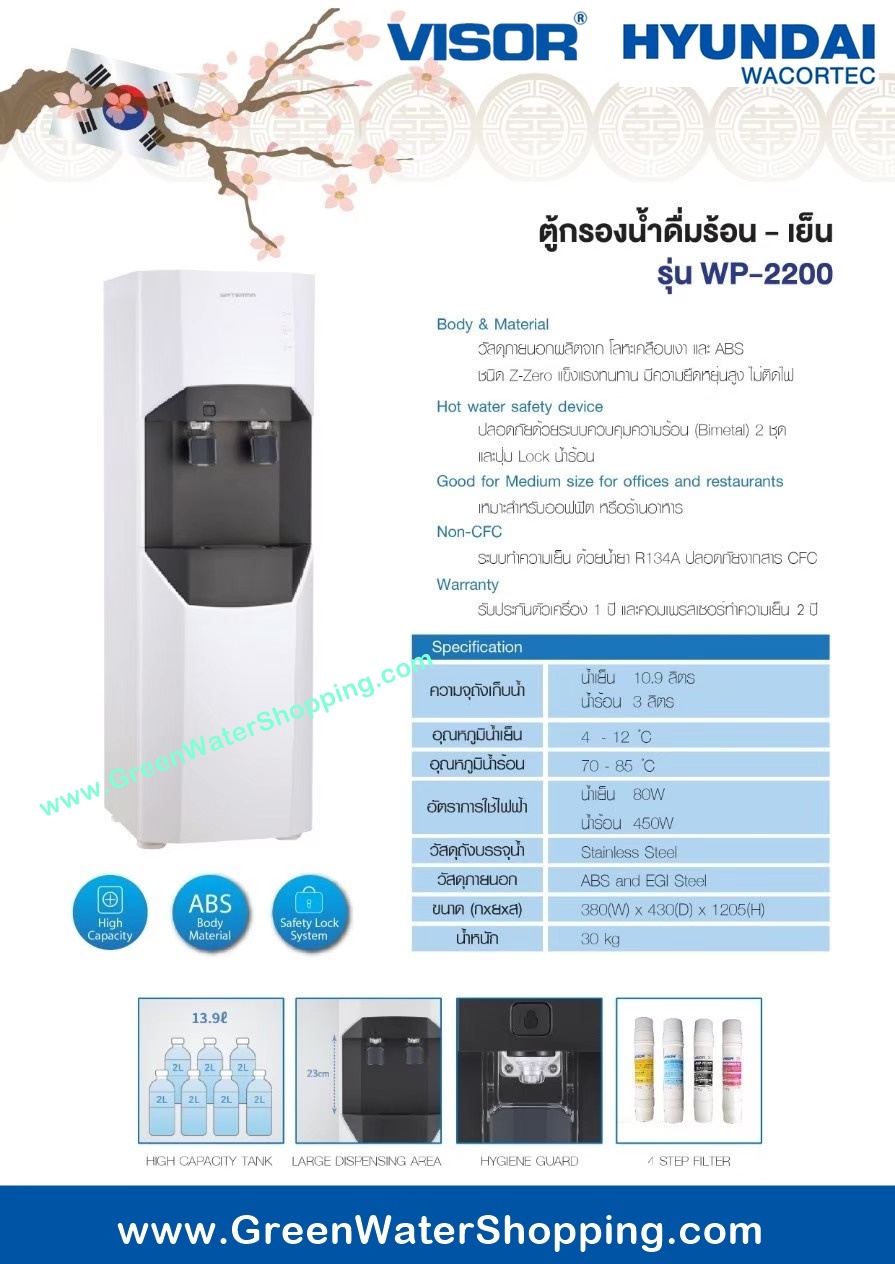 ตู้กดน้ำ VISOR Hyundai - รุ่น WP-2200 เป็นตู้กดน้ำที่เป็นการผสมผสานระหว่างดีไซน์ที่สวยงามและฟังก์ชั่นการใช้งานที่สมบูรณ์แบบ ตู้กดน้ำเย็น-น้ำร้อน VISOR Hyundai รุ่น WP-2200 เป็นตู้กดน้ำคุณภาพสูง ที่ผลิตจากประเทศเกาหลี มาพร้อมกับระบบการกรองน้ำ RO 4 ขั้นตอน ที่สามารถกรองน้ำได้ละเอียดถึง 0.00001 ไมครอน ช่วยให้คุณมั่นใจได้กับน้ำดื่มที่สะอาด เกือบบริสุทธิ์ ปราศจากเชื้อแบคทีเรีย เชื้อไวรัส เชื้อโรคใดๆ จึงทำให้ได้น้ำที่ สะอาด ปลอดภัย เหมาะแก่การดื่ม