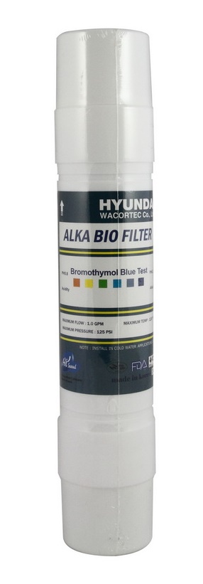 ไส้กรองน้ำฮุนได Alka-Bio แบบ Inline (ขนาด 2.5 x 13 นิ้ว) ไส้กรองคุณภาพสูงจากฮุนได ผลิตในเกาหลี (Made-In-Korea) เป็นไส้กรองน้ำสำหรับปรับสภาพน้ำให้เป็นน้ำอัลคาไลน์ คือมีความเป็นด่าง(เบส)อ่อนๆ ช่วยลดสภาพความเป็นกรดในร่างกาย โดยมีผลวิจัยว่าสามารถลดอัตราเสี่ยงการเป็นโรคมะเร็งได้ อีกทั้งยังมีพรายฟองออกซิเจน ดื่มแล้วร่างกายสดชื่นขึ้น