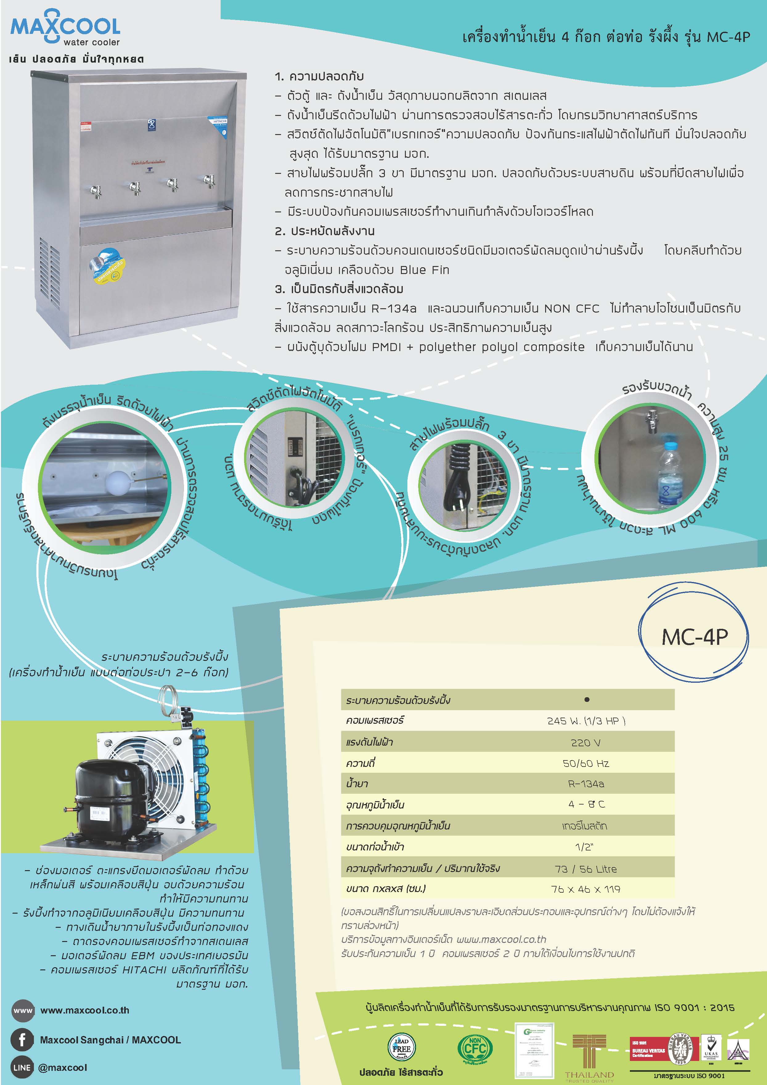 เครื่องทำน้ำเย็น สแตนเลส ต่อท่อ น้ำเย็น 4 ก๊อก Maxcool รุ่น MC-4P