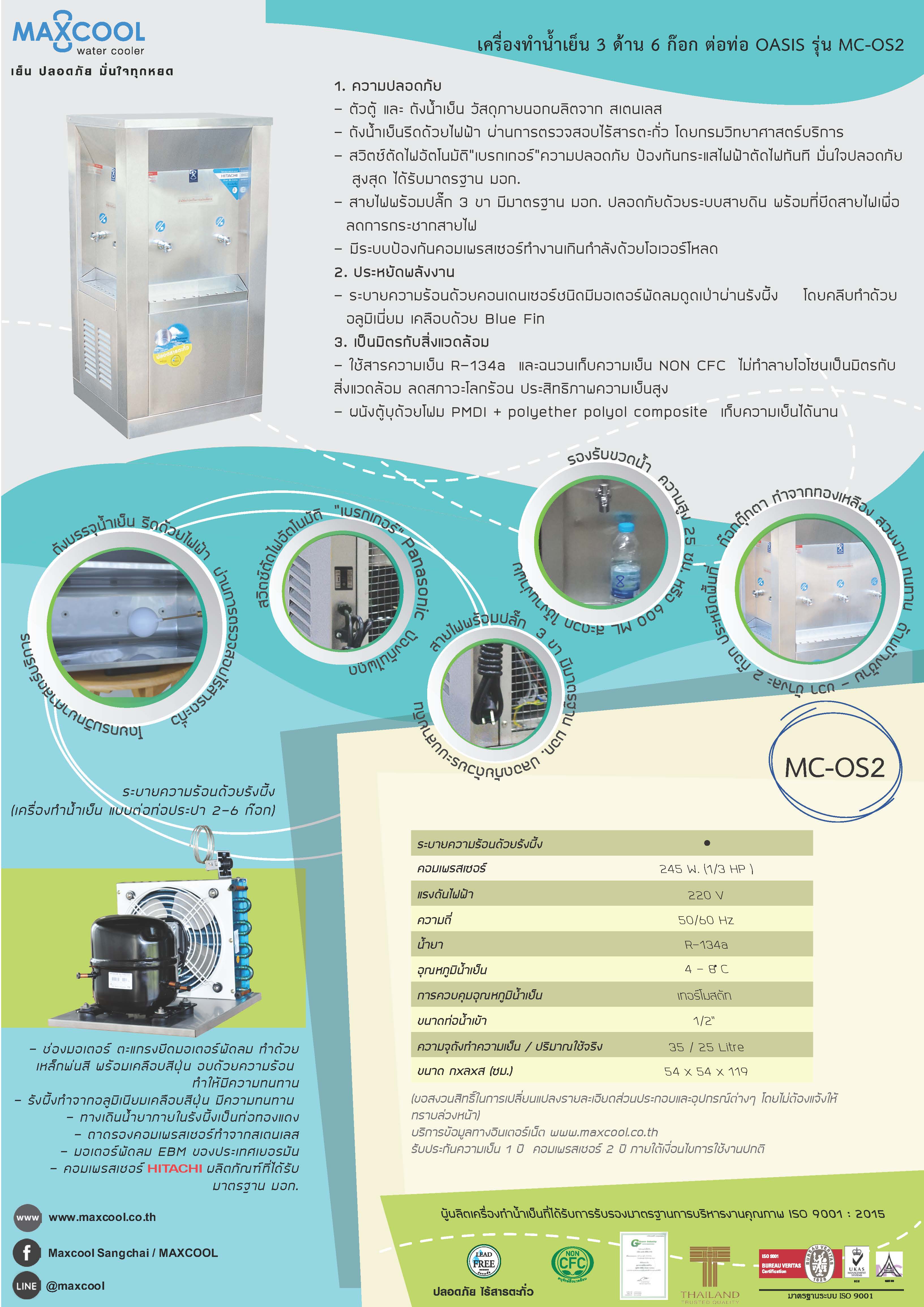 เครื่องทำน้ำเย็น สแตนเลส ต่อท่อ น้ำเย็น 3 ด้าน 6 ก๊อก Maxcool รุ่น MC-OS2