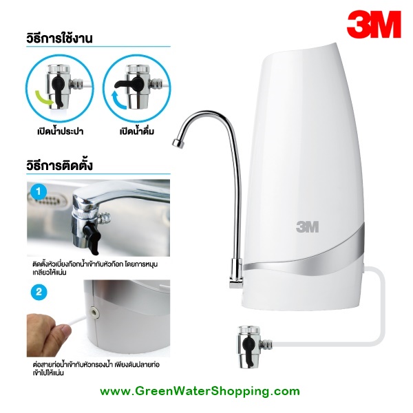 เครื่องกรองน้ำ 3M 3เอ็ม รุ่น ติดตั้งง่าย แบบตั้งโต๊ะเคาน์เตอร์ รุ่น Counter Top เครื่องกรองน้ำดื่ม 3เอ็ม รุ่น ตั้งโต๊ะ (Counter Top) มากับดีไซน์ที่สวยงาม ขนาดกะทัดรัด ติดตั้งง่ายด้วยตัวคุณเอง ไม่ต้องเจาะผนัง พร้อมทั้งประสิทธิภาพในการกรองที่ละเอียดถึง 0.5 ไมครอน สามารถกรองกลิ่น สี และรสคลอรีน กรองสารประกอบอินทรีย์ระเหยง่าย, ตะกั่ว และ สารปรอท และกรองเชื้อโรคได้ 99.9% ทั้งยังมีอายุการใช้งานไส้กรองที่สามารถกรองน้ำได้ถึง 2,800 ลิตร/ไส้กรอง อัตราการไหล 2.0 ลิตรต่อนาที (ขึ้นอยู่กับคุณภาพน้ำขาเข้า)