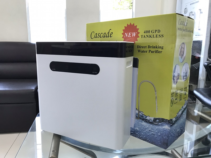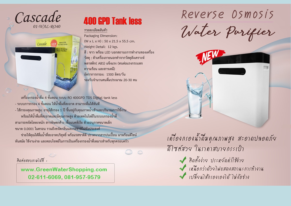 เครื่องกรองน้ำ RO 400 GPD Cascade ดีไซน์ใหม่ สวยเฉียบ มีขนาดกระทัดรัด ไม่ต้องใช้ถังพักน้ำให้เปลืองพื้นที่ มาพร้อมเทคโนโลยีการกรองน้ำที่สะอาดที่สุด และละเอียดที่สุด ด้วยความละเอียดการกรองสูงถึง 0.0001 ไมครอน ช่วยทำให้คุณมั่นใจได้กับน้ำดื่มที่สะอาด ปลอดภัย ปราศจากสิ่งปนเปื้อน ทั้งไวรัส, แบคทีเรีย, ตะกอน และสารโลหะหนัก เครื่องกรองน้ำ RO 400 GPD จากคาสเคด (Cascade) นี้ มาพร้อมระบบการกรองที่มีกำลังการผลิตสูงถึง 400 GPD หรือ 1600 ลิตรต่อวัน ทำให้ไม่จำเป็นต้องมีถังพักน้ำก็สามารถเปิดใช้น้ำดื่มได้อย่างทันใจ ทำให้หมดห่วงกับการผลิตน้ำดื่มไม่ทัน เหมาะกับบ้านเรือนที่ต้องการใช้น้ำปริมาณสูง หรือ ร้านกาแฟ, ออฟฟิศที่มีคนจำนวนมากได้