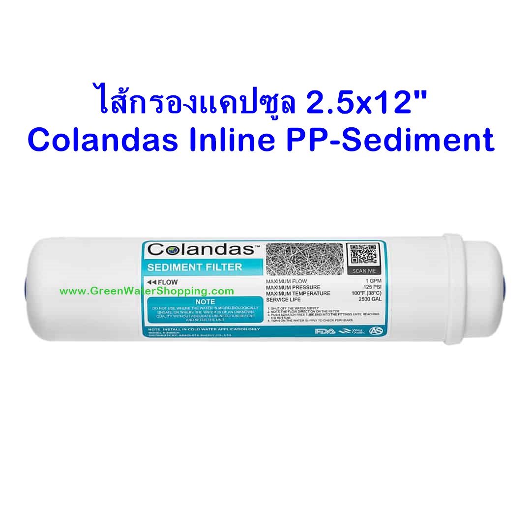 ไส้กรองน้ำแคปซูล Colandas Inline PP-Sediment 2.5 นิ้ว x 12 นิ้ว ไส้กรองน้ำแคปซุล Colandas PP-Sediment Inline (กรองหยาบ) ขนาด 12"x2.5" เส้นใยทำจาก โพลีโพรพีลีน กรองตะกอนแขวนลอยขนาดเล็ก เศษสิ่งสกปรกต่างๆ ที่ปนมากับน้ำ