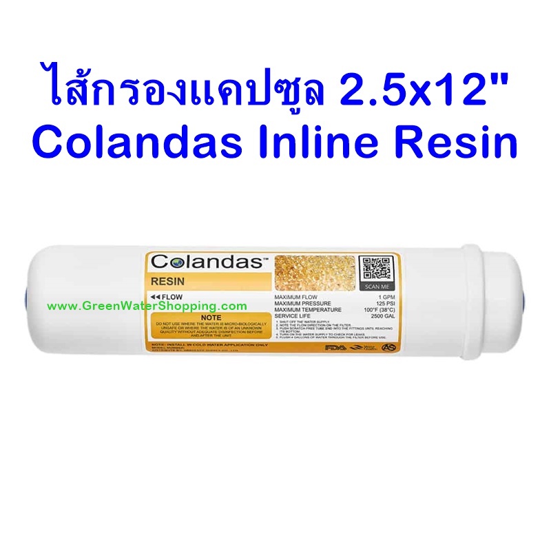 ไส้กรองน้ำแคปซุล Colandas Resin Inline ไส้กรองน้ำSoftener Filter (lon Exchange Resin) ขนาด 2.5 x 12 นิ้ว ทำหน้าที่ในการกำจัดความกระด้างของน้ำ โดยใช้หลักแลกเปลี่ยนประจุ โดยดักจับ Ca++ Mg++ แล้วปล่อย Na+ ทำให้น้ำที่ผ่านไส้กรองน้ำ Resin มีรสชาติ หวานนุ่มนวลขึ้น