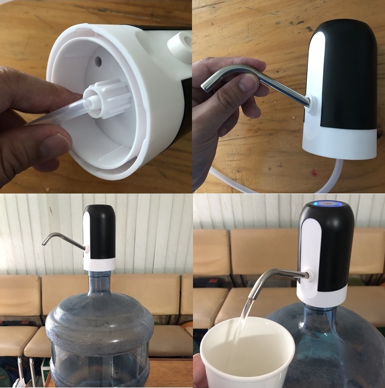 หัวปั้มน้ำแบบไฟฟ้าสำหรับดูดน้ำจากถังน้ำดื่ม 18.9 ลิตร (5 แกลลอน/ 20 ลิตร) เป็นหัวปั้มแบบไฟฟ้า ใช้งานง่ายดาย ไม่ต้องยกถังหนักๆ เทใส่เหยือกหรือแก้วน้ำอีกต่อไป เพียงกดปุ่มเปิดการทำงานเท่านั้น หัวปั้มไฟฟ้าจะดูดน้ำจากถังน้ำมาให้ท่านใช้ดื่มกินได้อย่างรวดเร็วทันที แถมยังติดตั้งง่าย ภายใน 1 นาทีเท่านั้น โดยเพียงต่อสายยางและหัวจ่ายน้ำดี แล้วนำไปใส่บนถังน้ำเท่านี้ก็เรียบร้อย มาพร้อมสาย USB สำหรับชาร์จไฟเข้าหัวปั้มเมื่อพลังงานแบตเตอรี่หมด