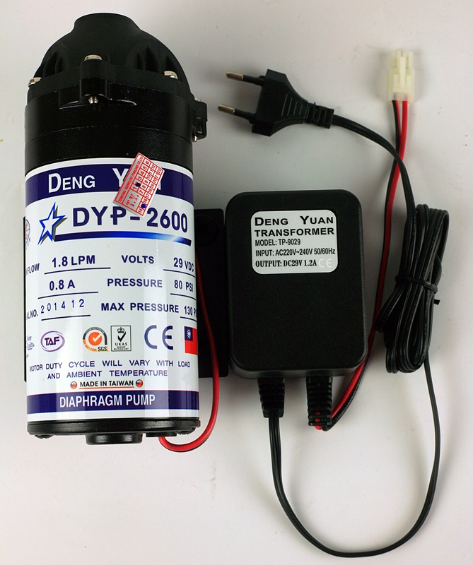 ปั้มอัด RO Pressure Pump Deng Yuan สำหรับ เครื่องกรองน้ำ ตู้น้ำหยอดเหรียญ ปั้มเด้งหยวน รุ่น TYP-2600 (DYP-2600) เป็นปั๊มน้ำชนิด Diaphram Pump ทำหน้าที่หลักเป็น R.O. Booster Pump (ปั๊มส่งน้ำแรงดันสูงเข้าไส้กรอง RO Membrane) มาพร้อมกับหม้อแปลงไฟบ้าน 220 VAC เป็น 29 VDC เพื่อต่อพ่วงกับปั้มน้ำ ปั๊มน้ำสามารถให้อัตราการไหลน้ำได้ 1.8 ลิตรต่อนาที (LPM) เมื่อใช้กับชุดกรอง สามารถให้แรงดันสูง 80-125 psi กินไฟ 1.2 Amp มาพร้อมหม้อแปลงไฟ 220 VAC - 29 VDC