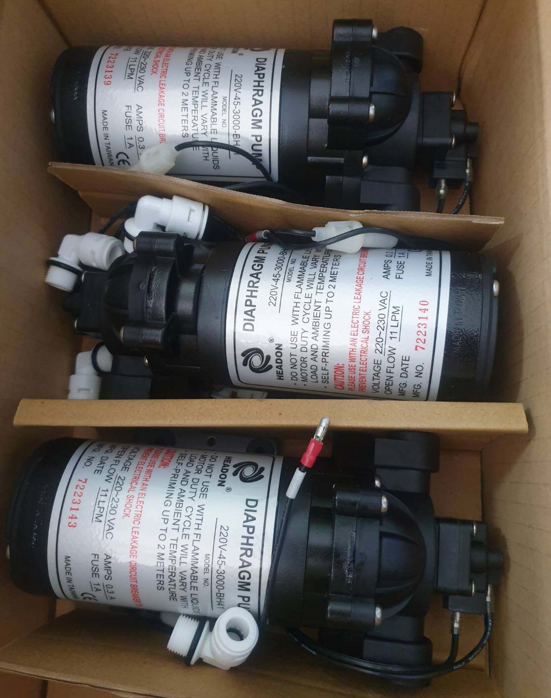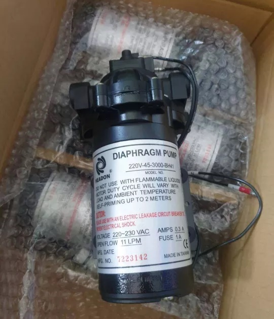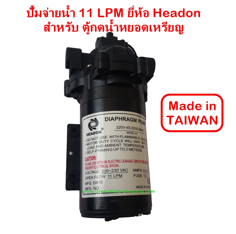 Water Pump - ปั้มจ่ายน้ำ Headon 11 LPM สำหรับตู้น้ำดื่มหยอดเหรียญ เป็นปั๊มน้ำชนิด Diaphram Pump ทำหน้าที่หลักเป็น Delivery Pump (ปั๊มจ่ายน้ำเพื่อไปบรรจุขวด) ปั๊มน้ำสามารถให้อัตราการไหลน้ำได้สูงสุด 11 ลิตรต่อนาที (3 แกลลอนต่อนาที) ใช้กับไฟฟ้า 220-230 VACS เป็นปั๊มคุณภาพสูง Made in Taiwan