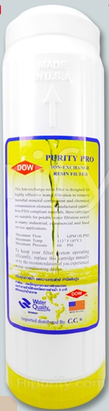 ไส้กรองน้ำSoftener Filter 10 นิ้ว (lon Exchange Resin) PURITY PRO สารกรอง DOW - Made in USA ทำหน้าที่ในการกำจัดความกระด้างของน้ำ โดยใช้หลักแลกเปลี่ยนประจุ โดยดักจับ Ca++ Mg++ แล้วปล่อย Na+ ทำให้น้ำที่ผ่านไส้กรองน้ำ Resin มีรสชาติ หวานนุ่มนวลขึ้น